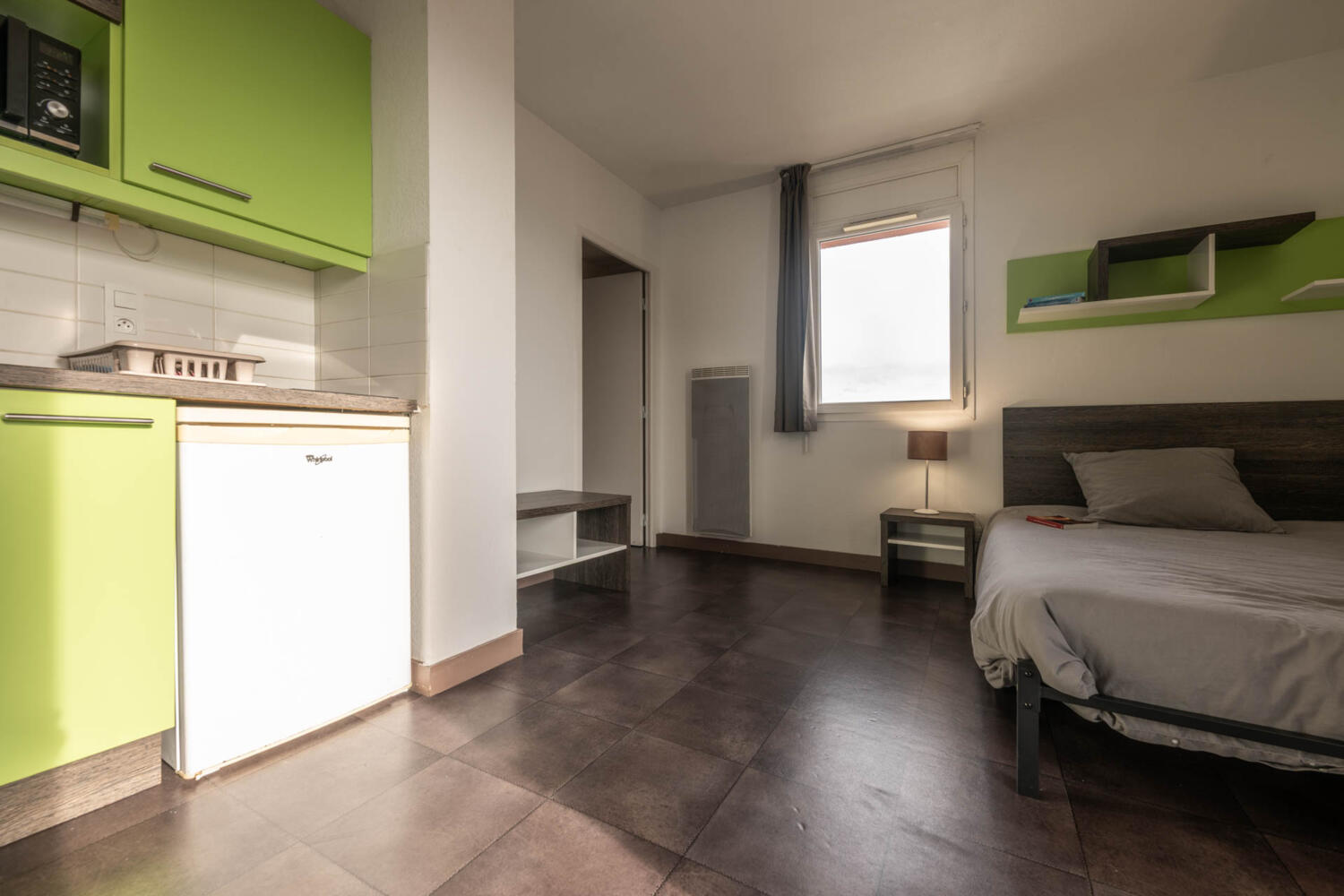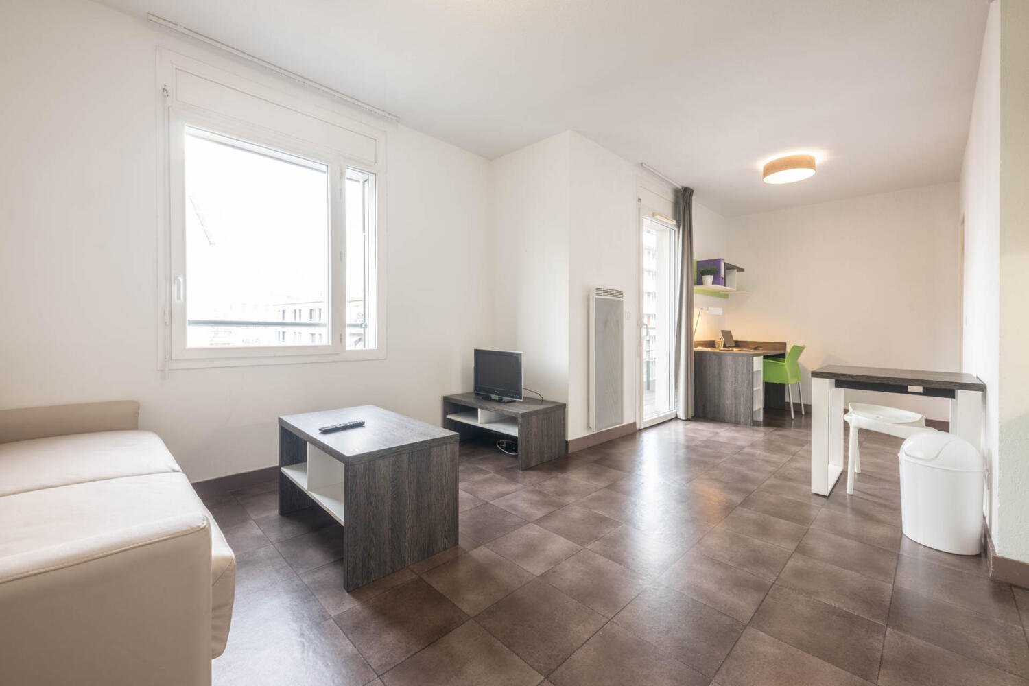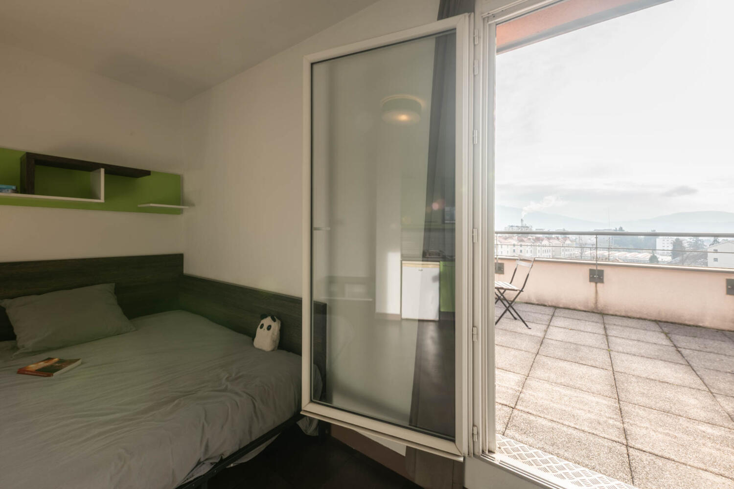 studio de 19m² pendant une durée de 10 mois pour études. Ce qui m'a fait craquer est la vue (les montagnes), un très grand et beau bureau, un aménagement très bien et moderne (table coulissante qui sort du bureau, lit simple qui peut se transformer en lit double, douche à l'italienne). Le fait de disposer d'une salle de sport spécifique à la résidence a aussi été très plaisant. De plus on a récemment eu l'installation de la fibre pour internet. Un peu sombre le soir et loin du tram .